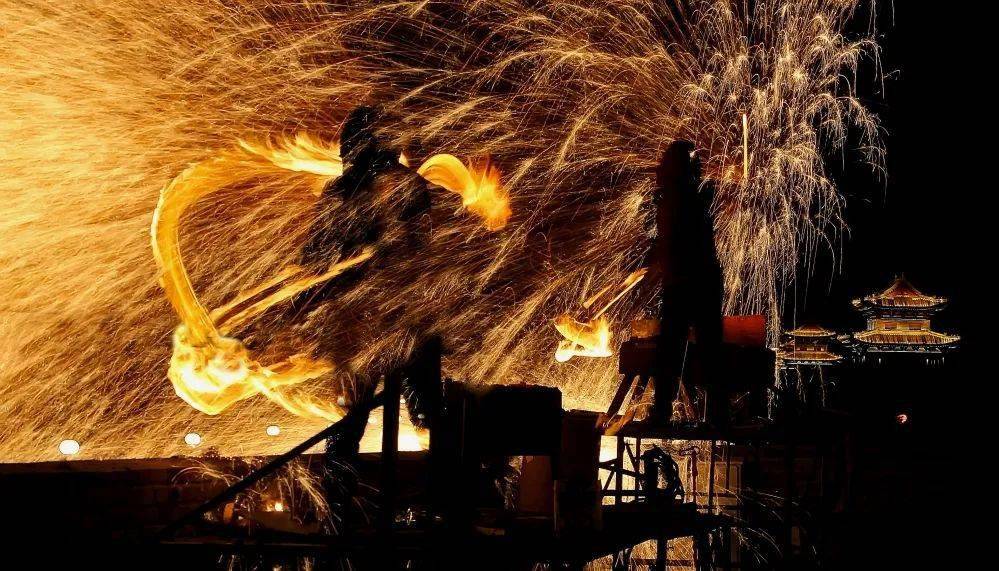 拍攝于2021.1.2日,忻州古城.由非遺 文化河南確山打鐵花來古城表演,拍攝用光圈11,曝光1秒的慢門速度使得鐵花飛舞呈現(xiàn)兩條金龍相對(duì)呼應(yīng),展示古城魅力,盛世華夏。