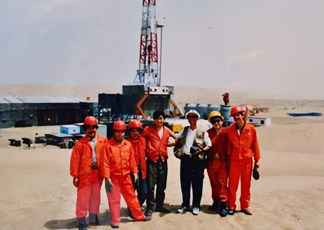 耿興余(右3)采訪在塔克拉瑪干沙漠復地,與塔中油田工人在一起。