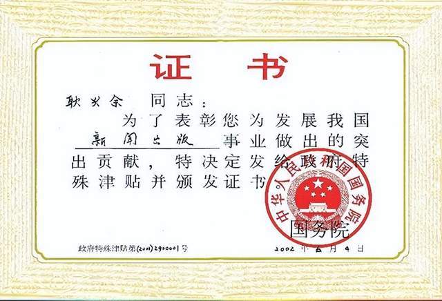 國務(wù)院頒發(fā)給耿興余在新聞出版事業(yè)做出突出貢獻專家證書。