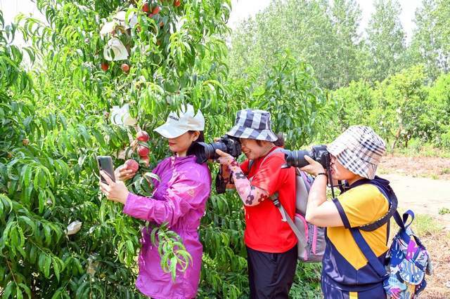 “好大的水蜜桃,樹枝上都掛滿了”“來這兒拍,這棵樹上的桃子又大又紅、晶瑩剔透,看著養(yǎng)眼又暖胃”……6月11日上午,位于登封市石道鄉(xiāng)術村——嵩少種植專業(yè)合作社的千畝果園里吸引了一大批攝影愛好者前來拍攝創(chuàng)作,大家紛紛用手中的像相、手機、航拍機記錄下滿園的果香、豐收在望的喜悅。