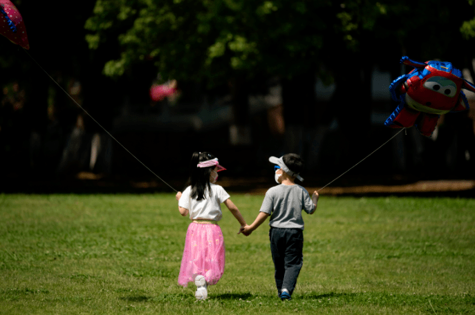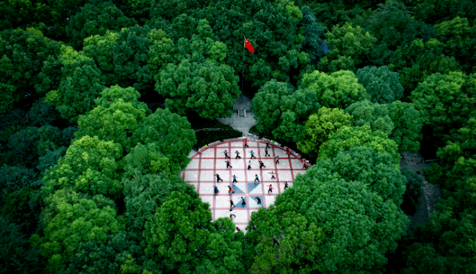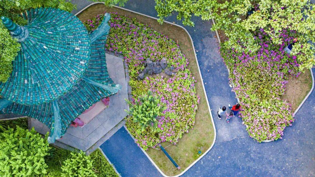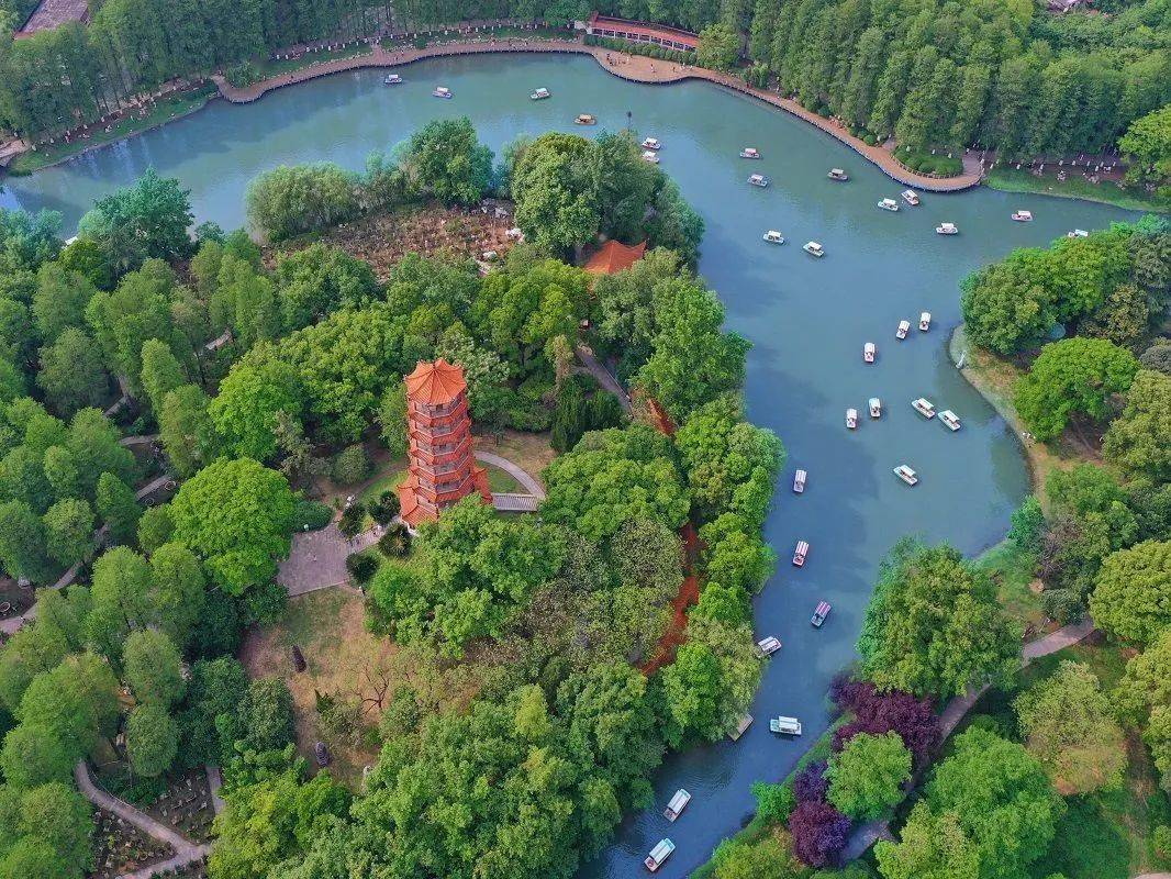從空中俯瞰解放公園,綠林鋪底,白帆點點