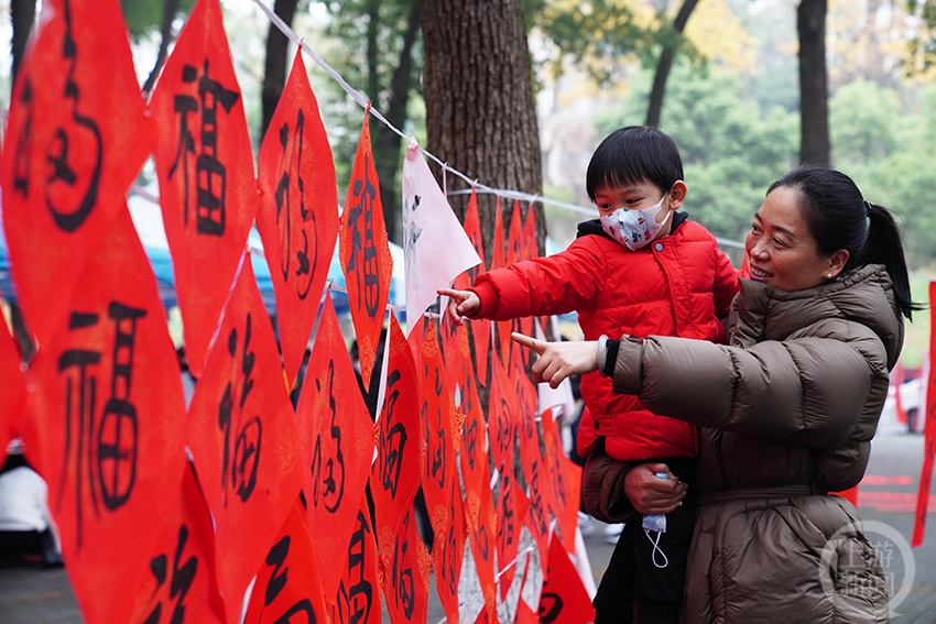 家長(zhǎng)帶著孩子在選取自己喜歡的福字。