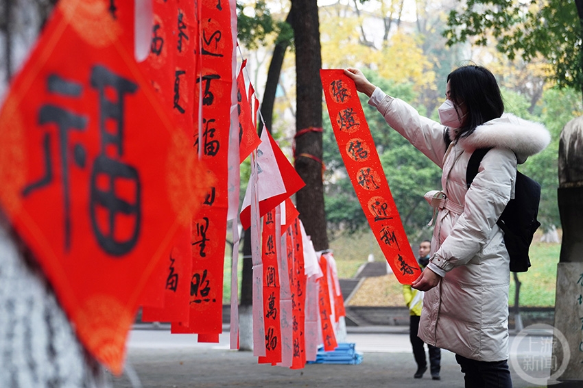 一名大學(xué)生在選取自己喜歡的春聯(lián)。