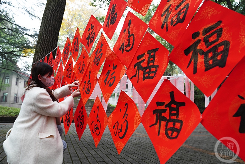 一名美術(shù)學(xué)院的學(xué)生在懸掛福字。