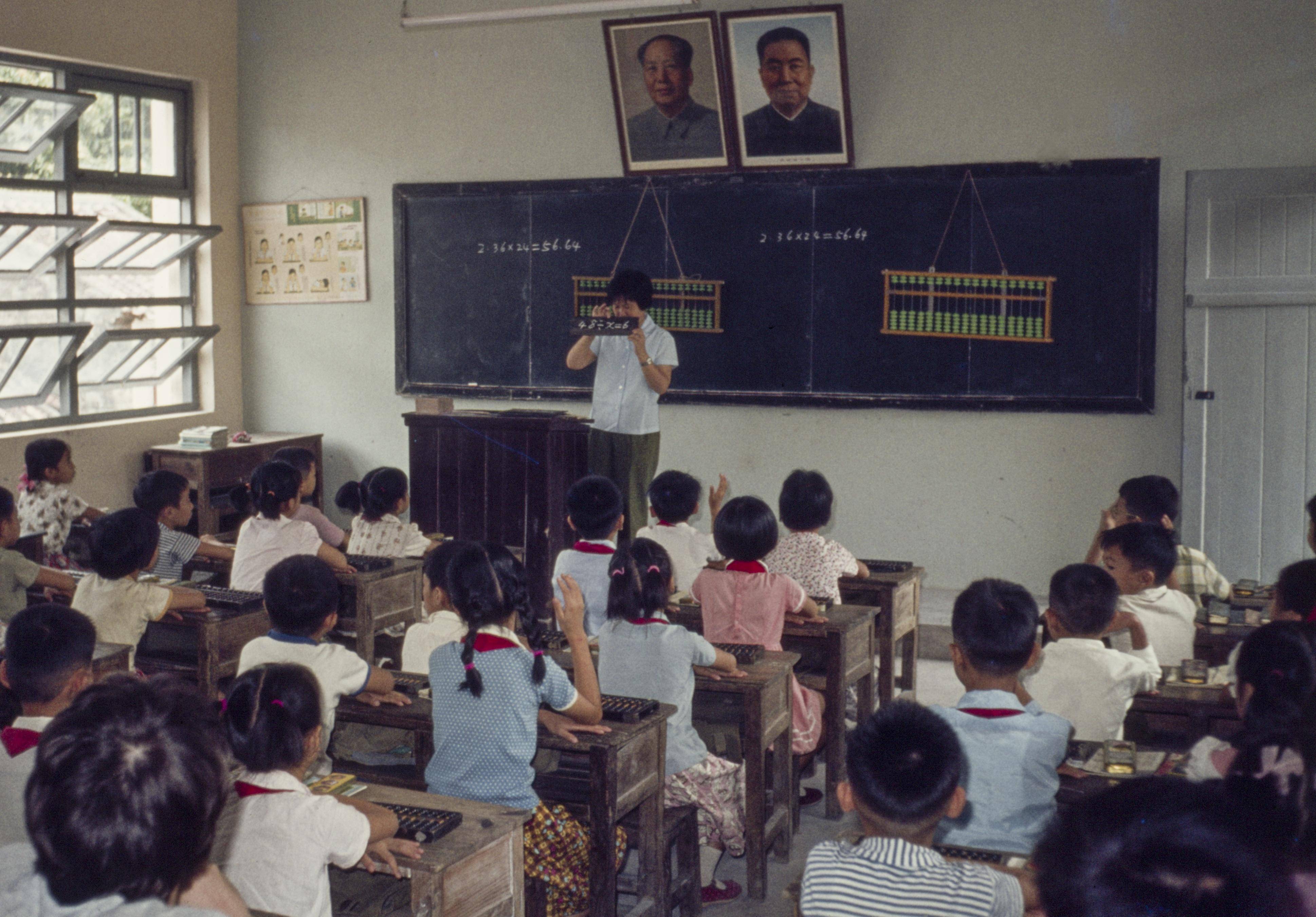 7、1978年的中國(guó)某地,由外國(guó)攝影人Paul Burns拍攝,這是在一所小學(xué)的課堂上,數(shù)學(xué)老師正在給同學(xué)們上數(shù)學(xué)課,黑板上掛著兩只算盤,老師手里拿著一塊講解板,孩子們都在認(rèn)真聽著。