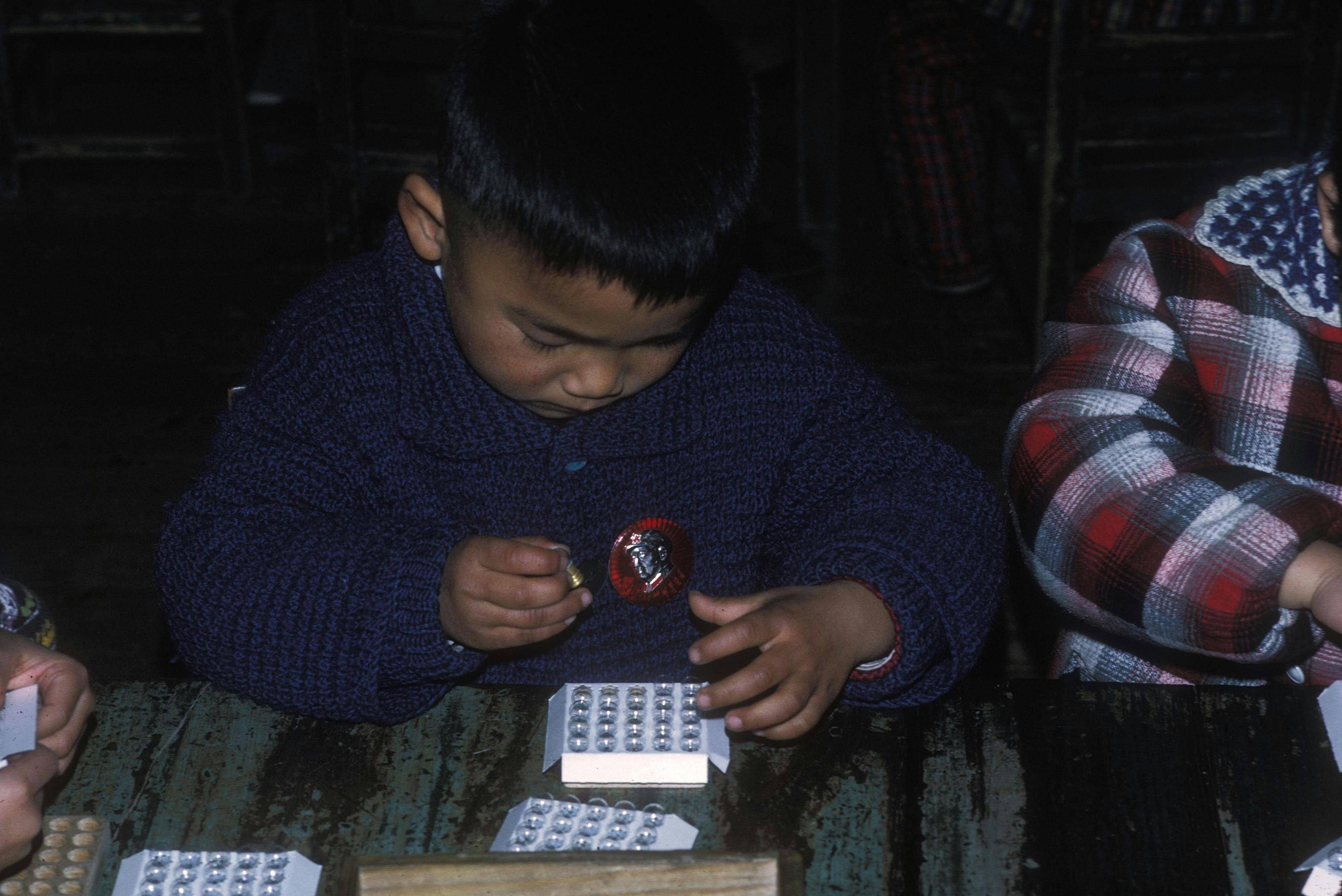 2、1972年的上海,由外國(guó)攝影人Joseph William A拍攝,在鳳凰工人新村的幼兒園內(nèi),孩子們從小就參加勞動(dòng),小男孩胸口掛著像章,手里認(rèn)真的往盒子里插著小燈珠,五十年彈指一揮間,期待今日的他能看到自己幼時(shí)的照片。