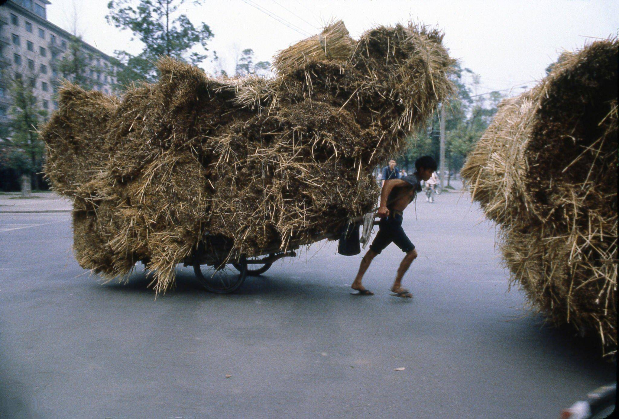 4、1979年的成都,由外國(guó)攝影人Nik Wheeler拍攝,在寬闊的大街上,一位年輕的小伙子,打著赤膊,穿著拖鞋,奮力地拉著板車,板車上堆滿了如山一般的稻草。