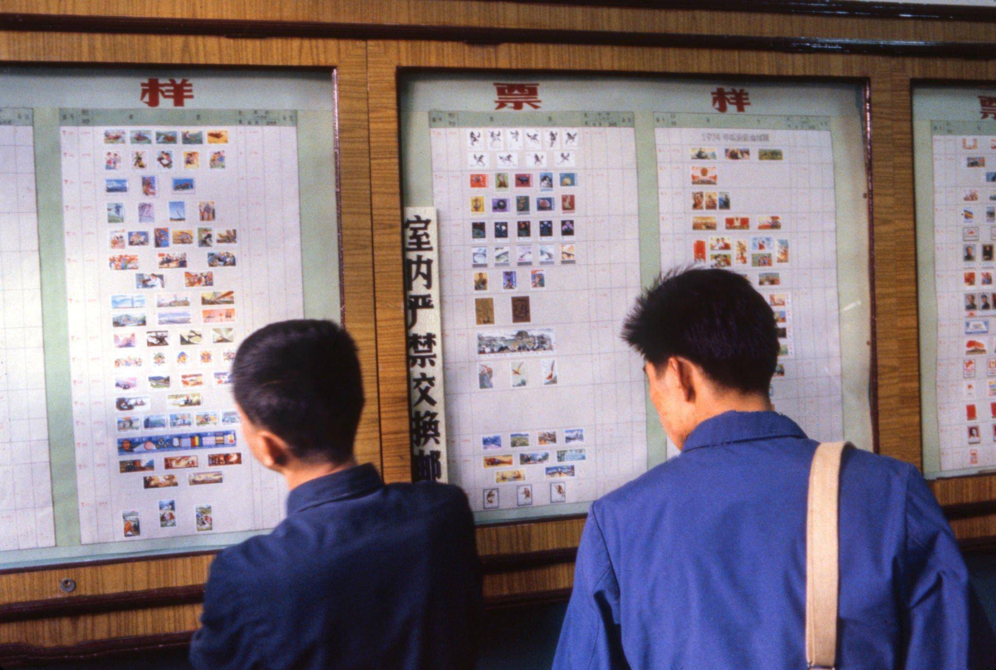 3、1979年的南京,由外國(guó)攝影人Paolo Koch拍攝,在郵電局的門前,兩位男子正在看著展框里的郵票,那時(shí)候集郵剛剛興起,中間張貼的紙條還寫著:“室內(nèi)嚴(yán)禁交換郵票”的字樣。